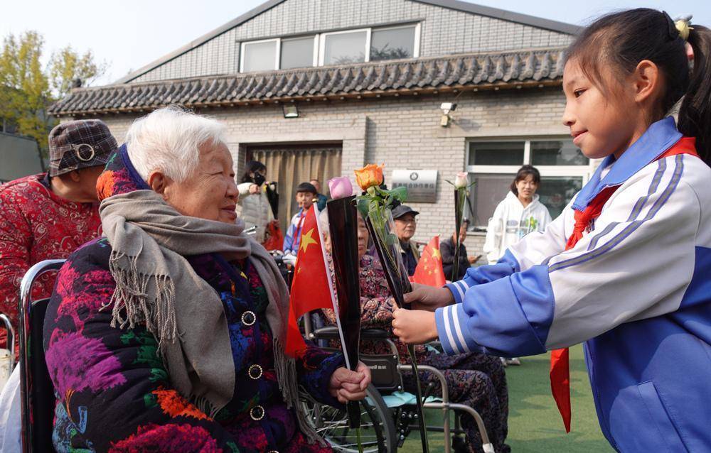 小学生为老人献花。傅新春摄