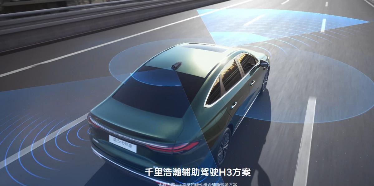 基于强大的底层架构,第5代帝豪在智能驾驶上实现了“两步走”的普惠突破。第一步是“标配普及”,将完整的L2级智能驾驶辅助系统下放至6万级车型,涵盖ACC自适应巡航、AEB自动紧急制动、LKA车道保持辅助等核心功能,让最入门的用户也能享受到主动安全与巡航便利。第二步则是“高阶可选”,推出了千里浩瀚辅助驾驶H3方案。该方案配备了包括3个毫米波雷达、11个高清摄像头在内的26个高精度传感器,形成了720度的感知冗余。配合128TOPS大算力芯片,它不仅能在高速上实现自动导航辅助驾驶,更计划通过OTA开放城市道路辅助驾驶,其独有的AES主动紧急避让功能,能在危机时刻主动转向避险,将智能安全提升至全新高度。
