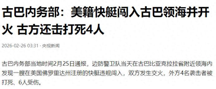3、2026-02-26 央视新闻 古巴内务部:美籍快艇闯入古巴领海并开火 古方还击打死4人