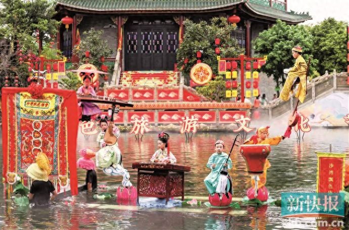 空中画卷展演以巨型凤凰腾飞震撼开场,翼展达6米的飞天凤凰凌空展翅于荔景湖上;水上奇观展示四板番禺水色,遴选了色仔数量多、观赏性强、难度系数大的水色“天籁之音”和独具特色的“包公出巡”“哪吒伏魔”“青萝三凤”等水色表演与游客见面,小演员们凌波而立,尽显番禺水色绝技。